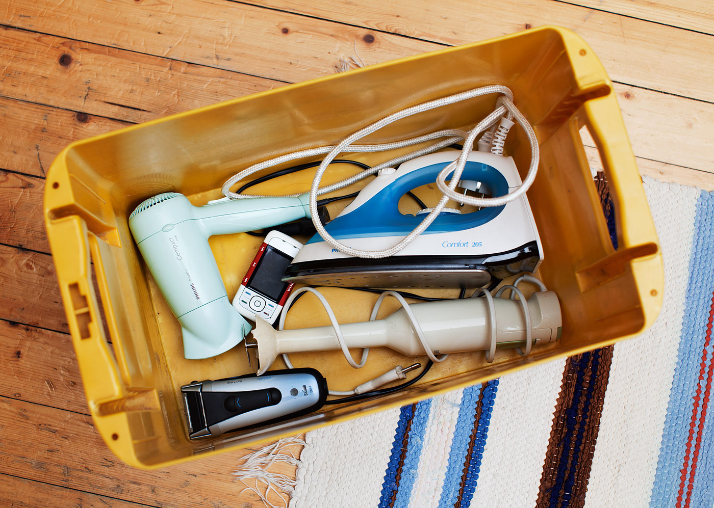 Hårføneren er ødelagt. Den gamle mobilen brukes ikke lengre og strykejernet er erstattet med et annet.