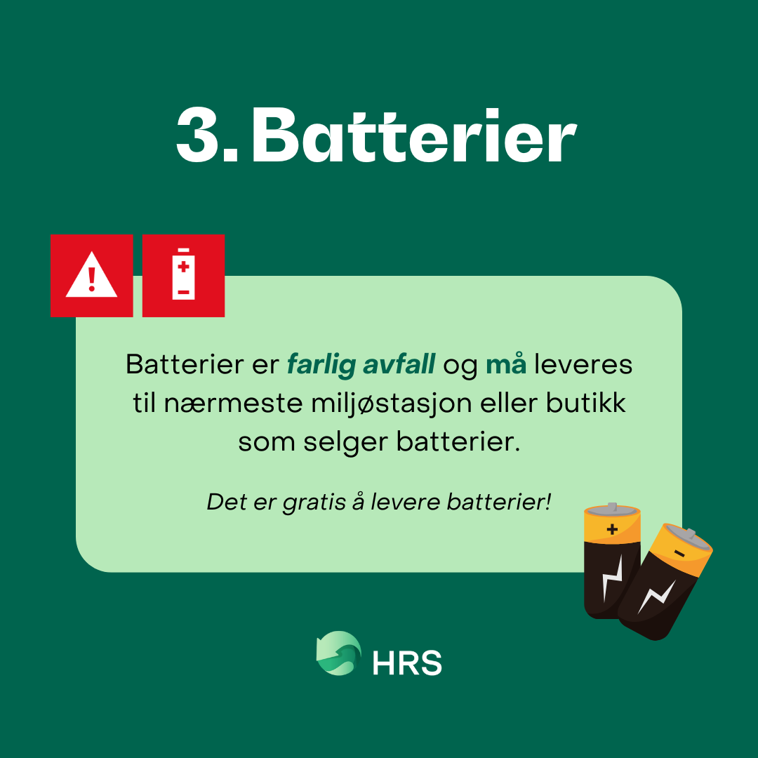 – Batterier går det mye av i desember, og da er det veldig viktig å huske på at disse ALDRI skal kastes i restavfallet, eller i noen av de andre beholderne du har hjemme. Batterier skal leveres til nærmeste miljøstasjon eller butikk som selger batterier, understreker Tonje.